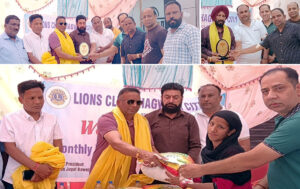ਤਸਵੀਰ: ਲਾਇਨਜ਼ ਕਲੱਬ ਫਗਵਾੜਾ ਸਿਟੀ ਵੱਲੋਂ ਕਰਵਾਏ ਸਮਾਗਮ ਦੌਰਾਨ ਮੁੱਖ ਮਹਿਮਾਨ ਭੁਪਿੰਦਰ ਕੌਸ਼ਲ ਅਤੇ ਵਿਧਾਇਕ ਧਾਲੀਵਾਲ ਨੂੰ ਸਨਮਾਨਤ ਕਰਦੇ ਹੋਏ ਲਾਇਨ ਤੇਜਿੰਦਰ ਬਾਵਾ, ਲਾਇਨ ਆਸ਼ੂ ਮਾਰਕੰਡਾ ਆਦਿ ਅਤੇ (ਹੇਠਾਂ) ਲੋੜਵੰਦ ਔਰਤ ਨੂੰ ਰਾਸ਼ਨ ‘ਤੇ ਪੈਨਸ਼ਨ ਭੇਂਟ ਕਰਦੇ ਹੋਏ ਕਲੱਬ ਪ੍ਰਧਾਨ ਲਾਇਨ ਜੁਗਲ ਬਵੇਜਾ ਅਤੇ ਹੋਰ।