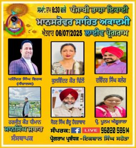 ਫ਼ਗਵਾੜਾ 07 ਜੁਲਾਈ (ਸੁਸ਼ੀਲ ਸ਼ਰਮਾ) ਪੰਜਾਬੀ ਭਾਸ਼ਾ ਇਕਾਈ ਮਾਨਸਰੋਵਰ ਸਾਹਿਤ ਅਕਾਦਮੀ ਰਾਜਸਥਾਨ ਵੱਲੋਂ ਮਿਤੀ 06 ਜੁਲਾਈ 2025 ਦਿਨ ਐਤਵਾਰ ਨੂੰ ਪੰਜਾਬੀ ਕਵੀ ਦਰਬਾਰ ਕਰਵਾਇਆ ਗਿਆ। ਜਿਸ ਵਿੱਚ ਕੁਲਵਿੰਦਰ ਕੌਰ ਢਿੱਲੋਂ, ਦਵਿੰਦਰ ਸਿੰਘ ਕਲੇਰ, ਹਰਜੀਤ ਕੌਰ ਧੀਮਾਨ, ਸੋਹਣ ਸਿੰਘ ਗੈਦੂ ਹੈਦਰਾਬਾਦ, ਪ੍ਰੋ. ਪੂਨਮ ਅੰਗੂਰਾਲਾ ਸ਼ਾਮਿਲ ਹੋਏ। ਪ੍ਰੋਗਰਾਮ ਦਾ ਆਗਾਜ਼ ਸੰਚਾਲਕ ਮਹਿੰਦਰ ਸੂਦ ਵਿਰਕ ਨੇ ਸ਼ਾਨਦਾਰ ਅੰਦਾਜ਼ ਵਿੱਚ ਕੀਤਾ। ਫਿਰ ਕੁਲਵਿੰਦਰ ਕੌਰ ਢਿੱਲੋਂ ਨੇ ਆਪਣੀ ਮਿਠਾਸ ਭਰਪੂਰ ਅਵਾਜ਼ ਵਿੱਚ ਗੀਤ ਤੇ ਗ਼ਜ਼ਲ ਸੁਣਾ ਕੇ ਸਰੋਤਿਆਂ ਤੋਂ ਵਾਹ-ਵਾਹ ਖੱਟੀ। ਸੋਹਣ ਸਿੰਘ ਗੈਦੂ ਅਤੇ ਪ੍ਰੋ. ਪੂਨਮ ਅੰਗੂਰਾਲਾ ਨੇ ਮਾਂ ਦੀ ਮਮਤਾ ਬਾਰੇ ਕਵਿਤਾਵਾਂ ਪੇਸ਼ ਕੀਤੀਆਂ। ਹਰਜੀਤ ਕੌਰ ਧੀਮਾਨ ਨੇ ਵੀ ਸਕੂਲ ਦੇ ਬੱਚਿਆਂ ਲਈ ਸੇਧ ਵਰਧਕ ਕਵਿਤਾਵਾਂ ਨਾਲ ਖੂਬ ਸਮਾਂ ਬੰਨ੍ਹਿਆ। ਦਵਿੰਦਰ ਸਿੰਘ ਕਲੇਰ ਨੇ ਵੀ ਬਦਲ ਰਹੀਆਂ ਆਪਸੀ ਕਦਰਾਂ ਕੀਮਤਾਂ ਬਾਰੇ ਕਵਿਤਾਵਾਂ ਨਾਲ ਹਾਜ਼ਰੀ ਭਰੀ। ਪ੍ਰੋਗਰਾਮ ਪ੍ਰਬੰਧਕ ਇਕਬਾਲ ਸਿੰਘ ਸਹੋਤਾ ਅਤੇ ਸੰਸਥਾਪਕ ਮਾਨ ਸਿੰਘ ਸੁਥਾਰ ਤੇ ਚੇਅਰਮੈਨ ਮੈਡਮ ਸੀਯਾ ਭਾਰਤੀ ਜੀ ਨੇ ਕਵੀ ਦਰਬਾਰ ਵਿੱਚ ਸ਼ਾਮਿਲ ਸਾਰੇ ਕਵੀ ਸਾਹਿਬਾਨ ਨੂੰ ਪ੍ਰਸ਼ੰਸਾ ਪੱਤਰ ਦੇ ਕੇ ਸਨਮਾਨਿਤ ਕਰਨ ਦਾ ਐਲਾਨ ਕੀਤਾ। ਅਖੀਰ ਸੰਚਾਲਕ ਸੂਦ ਵਿਰਕ ਨੇ ਔਰਤ ਦੇ ਹੱਕਾਂ ਬਾਰੇ ਸੁਨੇਹਾ ਦਿੱਤਾ।