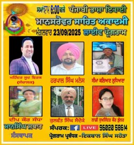 ) ਪੰਜਾਬੀ ਭਾਸ਼ਾ ਇਕਾਈ ਮਾਨਸਰੋਵਰ ਸਾਹਿਤ ਅਕਾਦਮੀ ਰਾਜਸਥਾਨ ਵੱਲੋਂ ਮਿਤੀ 23 ਸਤੰਬਰ 2025 ਦਿਨ ਮੰਗਲਵਾਰ ਨੂੰ ਪੰਜਾਬੀ ਕਵੀ ਦਰਬਾਰ ਕਰਵਾਇਆ ਗਿਆ। ਜਿਸ ਵਿੱਚ ਕਵੀ ਹਰਪਾਲ ਸਿੰਘ ਮਨੇਸ, ਸੀਮਾ ਕਲਿਆਣ ਲੁਧਿਆਣਾ, ਦੀਪ ਕੌਰ ਸੰਧਾ, ਲਾਡੀ ਸੁਖਜਿੰਦਰ ਕੌਰ ਭੁੱਲਰ, ਕੁਲਵੰਤ ਸਿੰਘ ਸੈਦੋਕੇ ਸ਼ਾਮਿਲ ਹੋਏ। ਪ੍ਰੋਗਰਾਮ ਦਾ ਆਗਾਜ਼ ਸੰਚਾਲਕ ਮਹਿੰਦਰ ਸੂਦ ਵਿਰਕ ਨੇ ਸ਼ਾਨਦਾਰ ਅੰਦਾਜ਼ ਵਿੱਚ ਕੀਤਾ। ਫਿਰ ਹਰਪਾਲ ਸਿੰਘ ਮਨੇਸ ਅਤੇ ਸੀਮਾ ਕਲਿਆਣ ਨੇ ਕਵਿਤਾਵਾਂ ਸੁਣਾ ਕੇ ਸਰੋਤਿਆਂ ਤੋਂ ਵਾਹ-ਵਾਹ ਖੱਟੀ। ਕੁਲਵੰਤ ਸਿੰਘ ਸੈਦੋਕੇ ਅਤੇ ਦੀਪ ਕੌਰ ਸੰਧਾ ਨੇ ਸੇਧ ਵਰਧਕ ਕਵਿਤਾਵਾਂ ਪੇਸ਼ ਕੀਤੀਆਂ। ਲਾਡੀ ਸੁਖਜਿੰਦਰ ਕੌਰ ਭੁੱਲਰ ਨੇ ਵੀ ਕਵਿਤਾਵਾਂ ਨਾਲ ਖੂਬ ਸਮਾਂ ਬੰਨ੍ਹਿਆ। ਪ੍ਰੋਗਰਾਮ ਪ੍ਰਬੰਧਕ ਇਕਬਾਲ ਸਿੰਘ ਸਹੋਤਾ ਅਤੇ ਸੰਸਥਾਪਕ ਮਾਨ ਸਿੰਘ ਸੁਥਾਰ ਤੇ ਚੇਅਰਮੈਨ ਮੈਡਮ ਸੀਯਾ ਭਾਰਤੀ ਜੀ ਨੇ ਕਵੀ ਦਰਬਾਰ ਵਿੱਚ ਸ਼ਾਮਿਲ ਸਾਰੇ ਕਵੀ ਸਾਹਿਬਾਨ ਨੂੰ ਪ੍ਰਸ਼ੰਸਾ ਪੱਤਰ ਦੇ ਕੇ ਸਨਮਾਨਿਤ ਕਰਨ ਦਾ ਐਲਾਨ ਕੀਤਾ। ਅਖੀਰ ਸੰਚਾਲਕ ਸੂਦ ਵਿਰਕ ਨੇ ਕਿਹਾ ਕਿ ਚੰਗੇ ਕਲਮਕਾਰ ਇੱਕ ਸਿਹਤਮੰਦ ਅਤੇ ਚੰਗੇ ਸਮਾਜ ਦੇ ਸਿਰਜਨਹਾਰ ਹੁੰਦੇ ਹਨ।